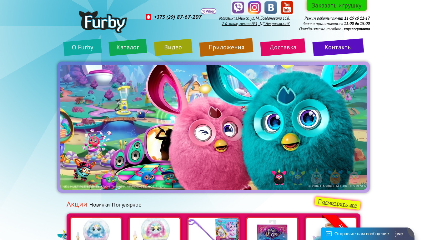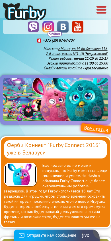 | AI-анализ | This online resource is a Russian-language e-commerce store specializing in the sale of Furby interactive toys. Located in Minsk, Belarus, the store offers a wide range of Furby products for customers across the country. The website provides information on purchasing original Furby toys at competitive prices. The physical store can be found at Ulitsa M. Bogdanovich 118, 2nd floor, place #1, in the "Nekrasovsky" shopping center in Minsk. The store operates Monday to Friday from 11 a.m. to 7 p.m., and on Saturdays from 11 a.m. to 5 p.m. Online orders can be placed around the clock. The store also offers delivery services. The website includes sections for articles, reviews, and a catalog featuring FurReal Friends Magic Mixies and videos, as well |