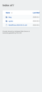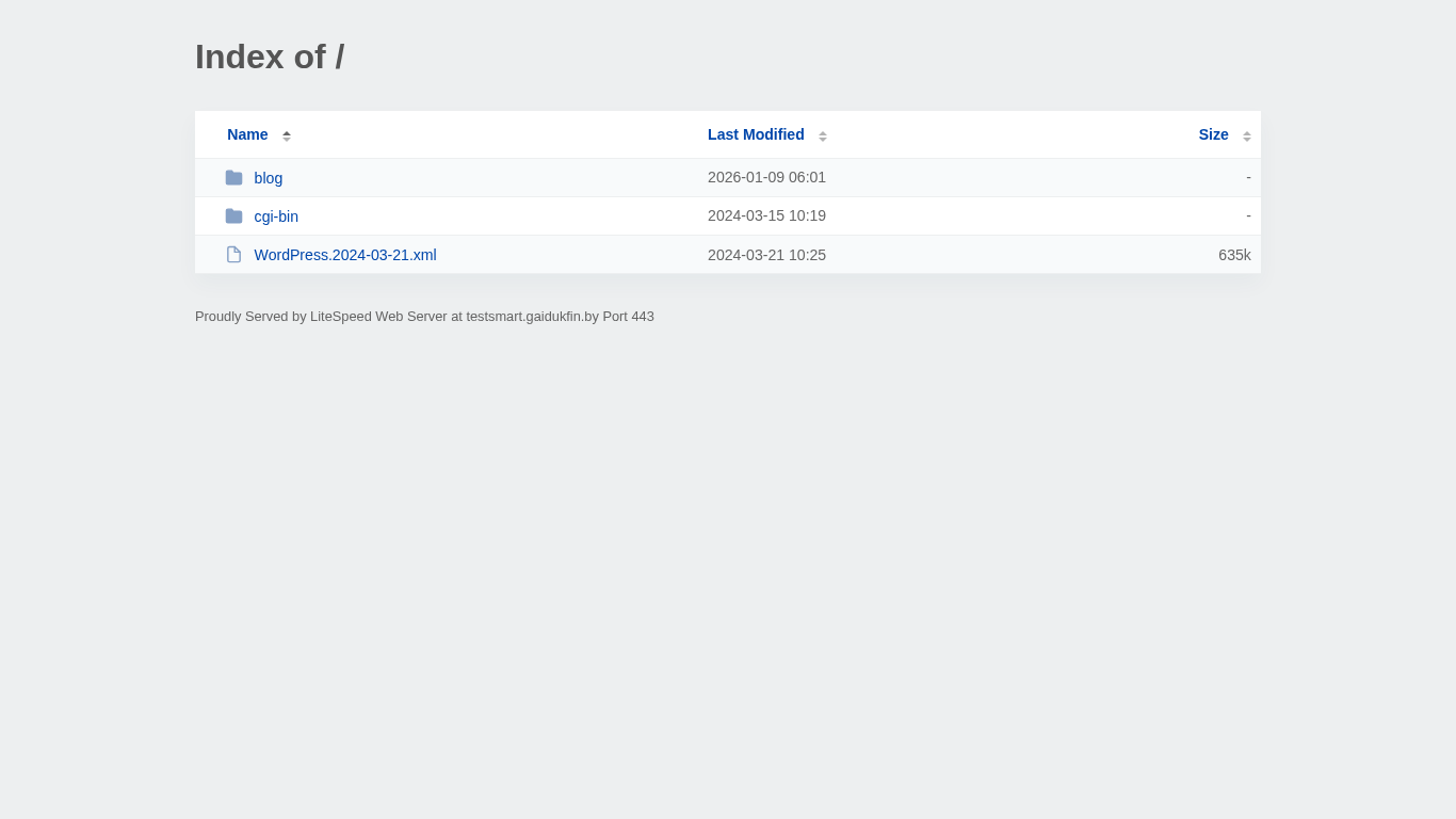 | AI-анализ | type: web server This online resource, testsmart.gaidukfin.by, is a web server that hosts various files and directories. The homepage is an index listing of these files and directories, including a blog from March 21, 2024, and a WordPress XML file from the same date. The server uses the LiteSpeed Web Server and was last modified on March 15, 2024. Other files include a 'cgi-bin' directory, last modified on March 15, 2024, and a file named 'WordPress.2024-03-21.xml', which is 635k in size. The blog was last updated on January 9, 2026. |