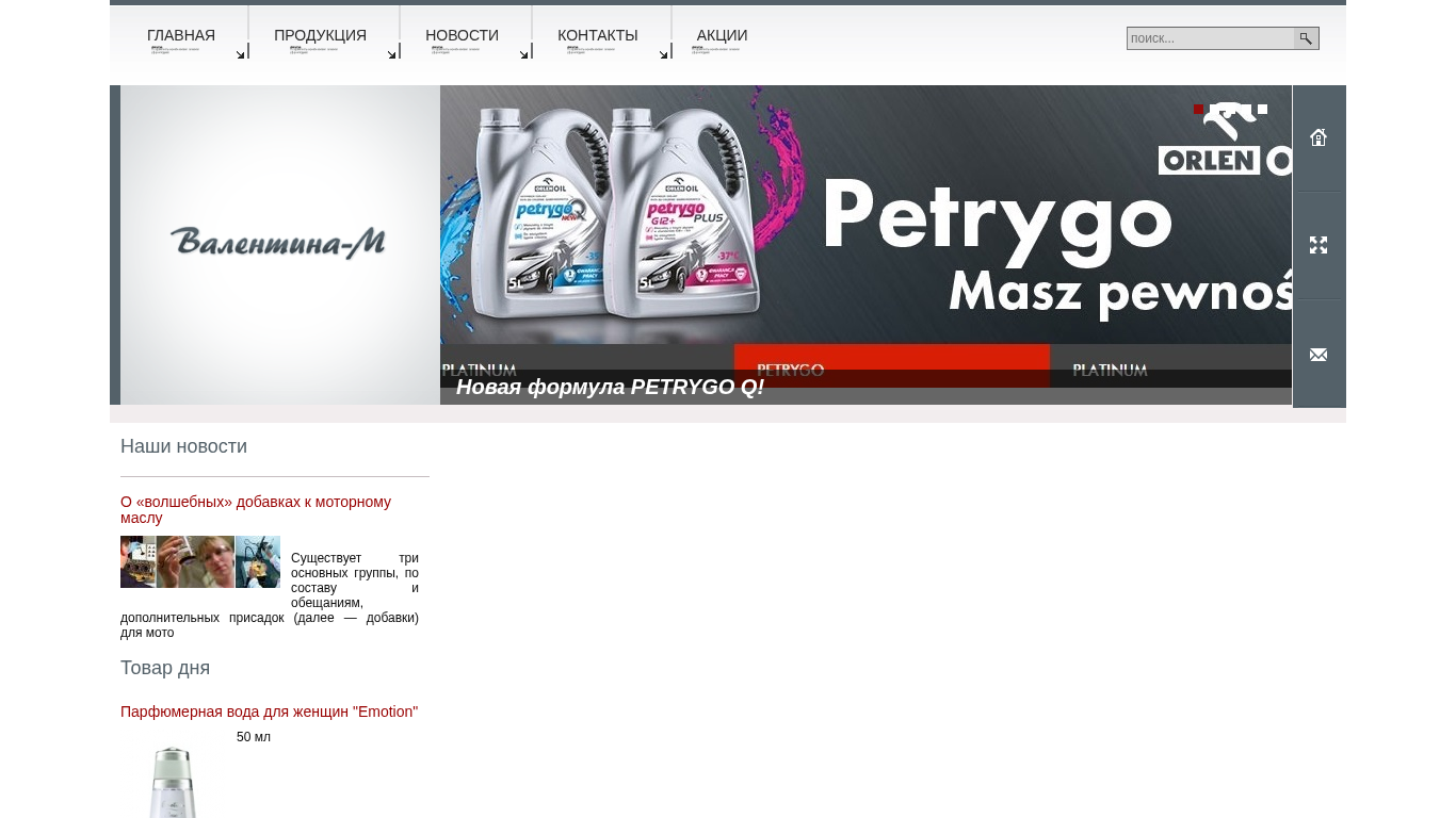 | AI-анализ | --- This website is an online store selling various types of oils and lubricants, including motor oils, industrial oils, hydraulic oils, and engine oils for cars and heavy machinery. The products range from vacuum oils, gear oils, and compressor oils to specialty and thermal-resistant lubricants. Orlen Oil is a prominent brand featured on the website, offering both motor and industrial oils. The store also sells lubricants for railway use, as well as various types of smoothing agents. Additionally, the website offers a selection of perfumes, cosmetics, and gift sets for women and men. There are also catalogs available for Orlen Oil's motor and industrial oil products. The website includes news, contacts, and information about promotions, such as the Platinum Racing Team's participation in a 24-hour race in Dubai |