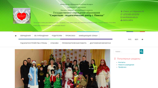 | AI-анализ | The portal "Social-Pedagogical Center of Pinsk" is an educational institution under the Ministry of Education of the Republic of Belarus in Pinsk city. The website offers various services related to education, prevention, and social care for children and families. Visitors can find information on administrative procedures, contacts, and news. The site includes sections for specialists, methodological cabinet, anti-corruption activities, counseling for parents, and a club for children named "Tepla Dusha" (Warm Hearts). There are also sections on adoption processes, forms of family life, and educational materials for download. The site also features a news section, an announcement board, and a calendar of events. The contact information for the center is provided, including a phone number and email address. The site is designed to assist and support families and children in various aspects of their lives. |