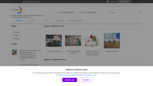 | AI-анализ | Сайт является производителем полиэтиленовых пакетов в Беларуси — VT Polimir Plus. Он предлагает полиэтиленовые пакеты для продажи на оптом для сетей розничной торговли по низким ценам и с возможностью нанесения логотипа на пакет. Сайт содержит информацию о компании, контакты, условия доставки и способы оплаты. Он продает различные виды одноразовых и упаковочных товаров, включая бумажные салфетки, бумажные полотенца, туалетную бумагу и бумажные стаканчики, а также полиэтиленовые пакеты для различных применений. Сайт предоставляет контактную информацию о специалистах по продажам и менеджере, а также перечисляет доступные товары с ценами и количествами. Сайт на белорусском языке, домен — vt-polimir-plus.by. |