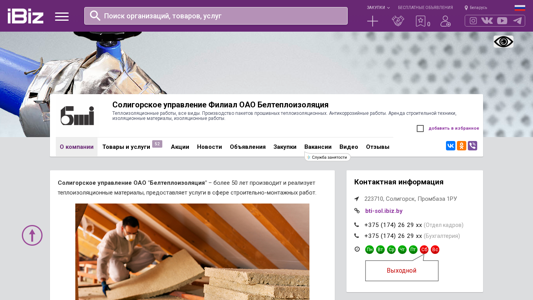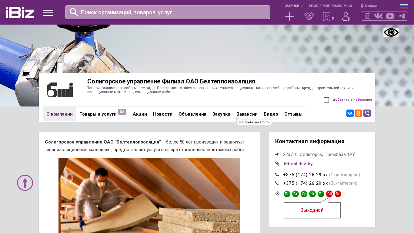 favicon Солигорское управление Филиал ОАО Белтеплоизоляция - Теплоизоляционные работы, все виды. Производство пакетов прошивных теплоизоляционных. Антикоррозийные работы. Аренда строительной техники, изоляционные материалы, изоляционные работы.. 223710, Солигорск, , Промбаза 1РУ