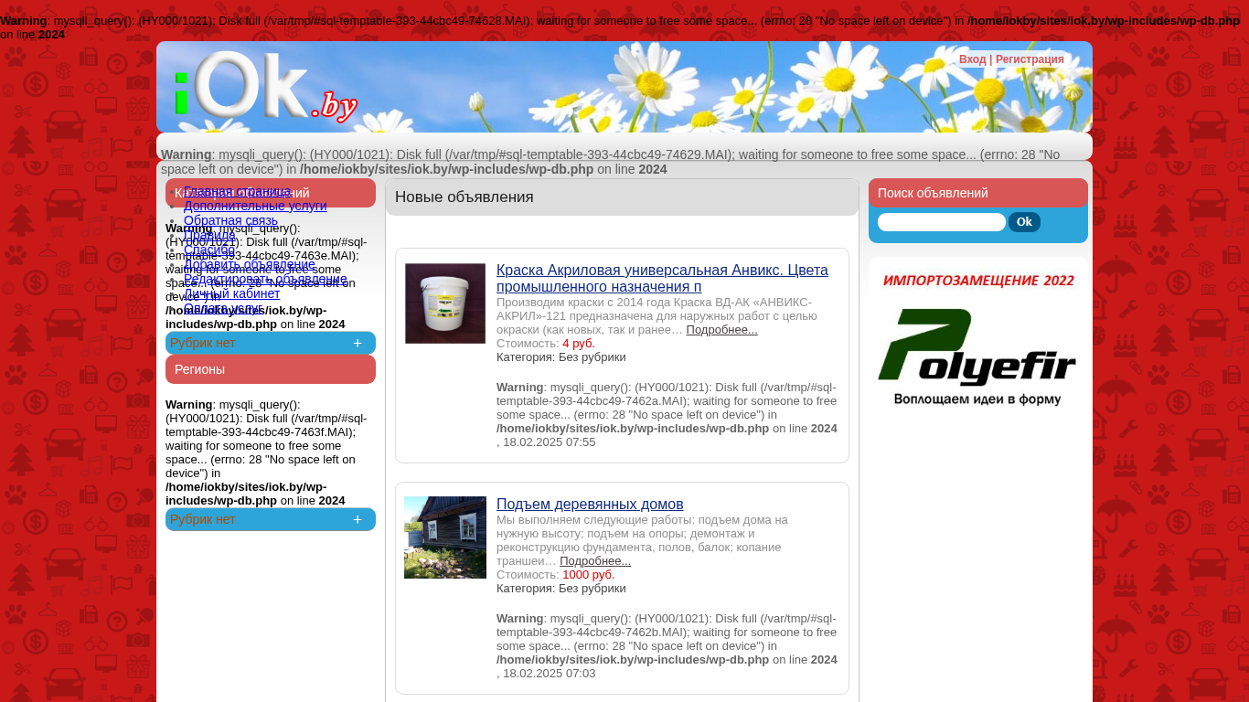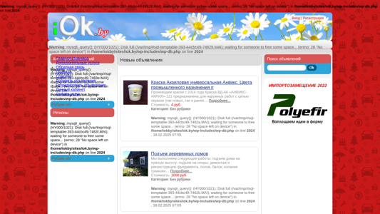 | AI-анализ | Портал iOk.by представляет собой бесплатный сайт объявлений в Беларуси. Пользователи могут размещать объявления без регистрации. Сайт предлагает различные категории, такие как продажа автомобилей, недвижимость, компьютеры и мобильные телефоны. Однако на данный момент он сталкивается с проблемами дискового пространства и отображает сообщения об ошибках из-за заполненного временного каталога. Сайт включает в себя функции регистрации, восстановления пароля, главной страницы, дополнительных услуг, контактной информации и правил использования сайта. Некоторые из публикаций на сайте предлагают универсальный акриловый лак и услуги по подъему деревянных домов. |