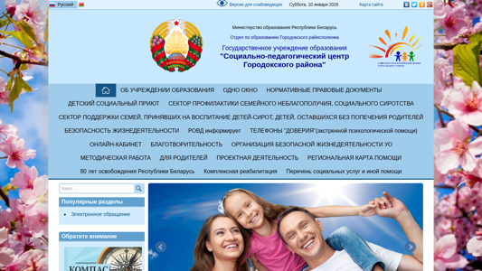 Веб-сайт является социальным и образовательным центром для Городокского района в Беларуси. Название звучит как "СПЦ Городокского района" (Sotsialno-Pedagogicheskii Tsentr or Social-Pedagogical Center of Gorodok District). Описание упоминает "министерство образования Республики Беларусь" и "Отдел по образованию Городокского райисполкома". Ключевые слова включают "образования", "детей", "Беларусь", и "помощи". Наиболее часто встречаются слова "читать", "далее", "новости".