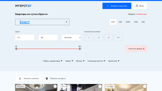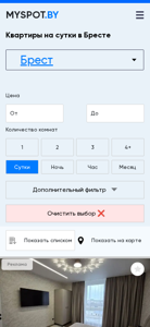 | SEO-описание | Снять квартиру на сутки в Бресте на сайте ★ MySpot ★. Посуточная аренда квартир с фото, контактами, ценами и описанием на: ✓ сутки ✓ ночь ✓ час ✓ месяц. |
