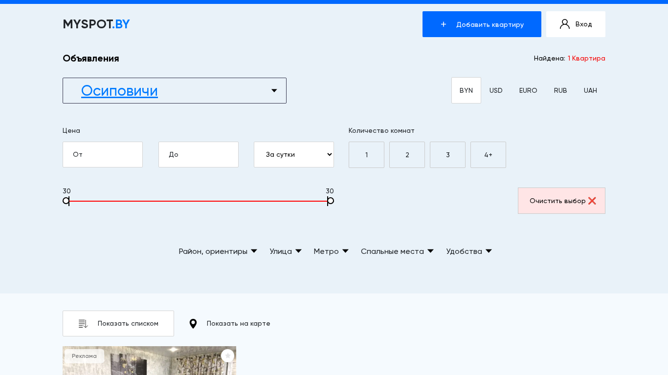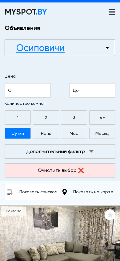 The website is an advertising platform for renting apartments in Osiopovichi, Belarus, on a daily basis. It offers the widest selection of apartments for rent in any country, with the focus on this particular city. Users can search for apartments based on location, number of rooms, price, and additional filters like neighborhood, amenities, and apartment features. The website provides direct contacts to apartment owners, eliminating the need for intermediaries and potentially lowering costs. The interface includes a map view, and users can choose to view listings or view them on a map. The website also offers a section for special deals and promotions. The domain name is osipovichi.myspot.by, and the organization that owns the website is OOO 'GoodSpot' with UNP 193350030.