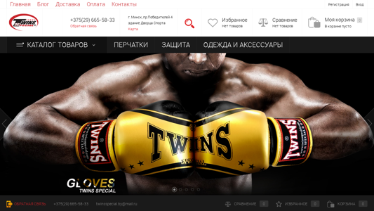 | SEO-описание | Магазин спортивной экипировки для единоборств Twins.by: здесь можно купить грушу и перчатки для бокса, спортивную одежду фирмы Twins Special в Минске. Доставка по всей Беларуси. |