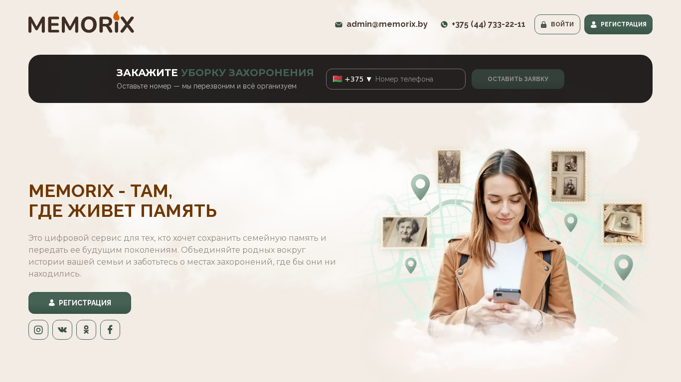 | SEO-описание | Создайте семейную книгу, укажите координаты захоронений, откройте доступ родным. Уборка, ремонт, цветы — всё через Memorix.by. |