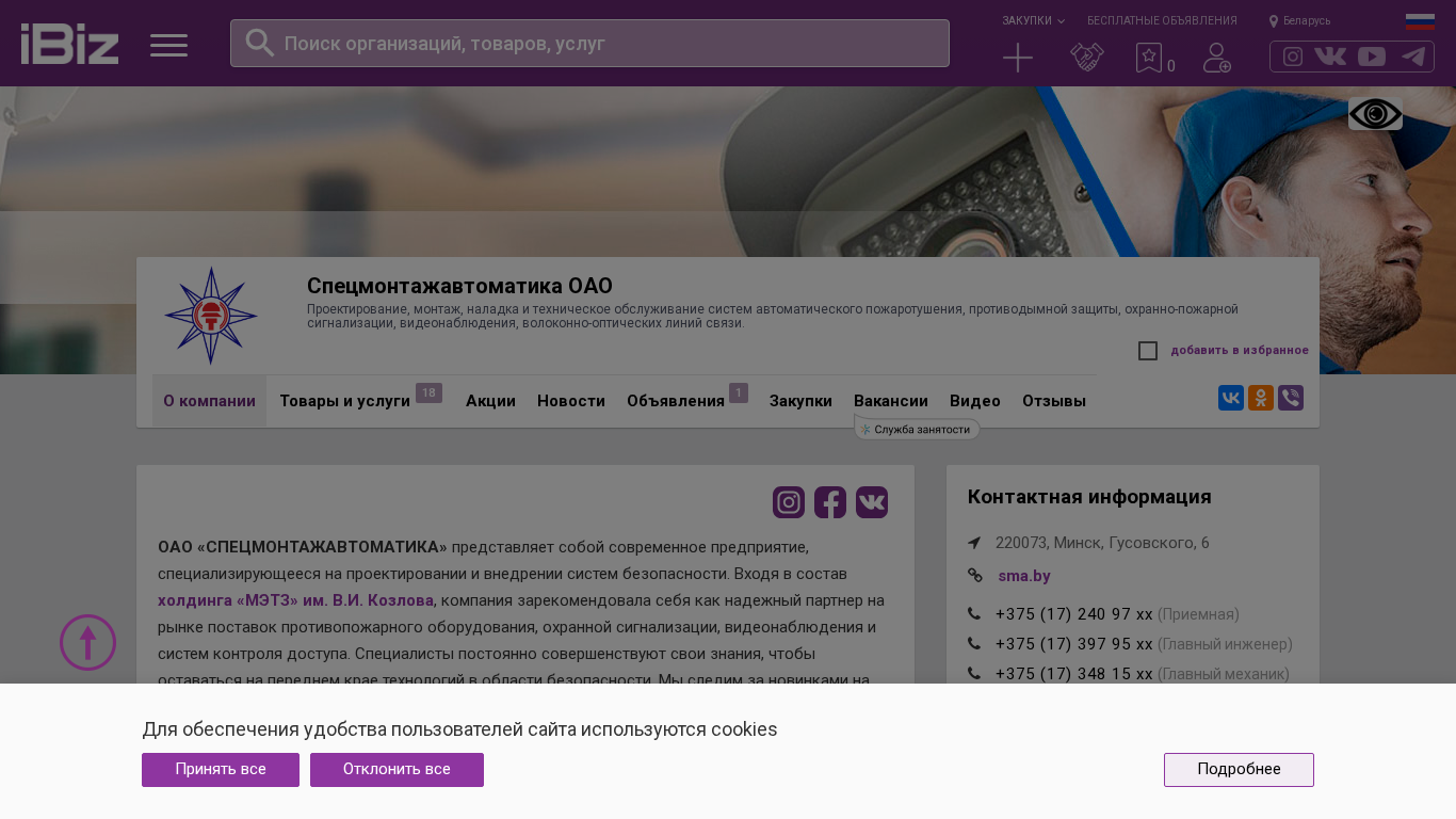 | Название / Заголовок | Спецмонтажавтоматика ОАО - Проектирование, монтаж, наладка и техническое обслуживание систем автоматического пожаротушения, противодымной защиты, охранно-пожарной сигнализации, видеонаблюдения, волоконно-оптических линий связи.. 220073, Минск, , Гусовского, 6 |
