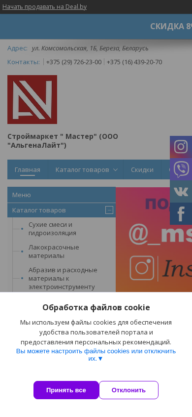 Этот онлайн-ресурс представляет собой белорусский электронный магазин под названием "Строймаркет Мастер" (ООО "АльгенаЛайт"). На сайте представлены различные контакты, товары и услуги, а также цены. Среди ключевых слов, ассоциируемых с сайтом, можно выделить "товары", "материалы", "инструмент", и "мастер". Сайт содержит каталог товаров, включающий в себя различные смеси и изоляционные материалы, лакированные материалы, абразивные вещества и аксессуары для электроинструментов, проникающие жидкости, прокладки, сантехнические изделия, системы вентиляции, клеи, инженерные системы, ручной инструмент, другие товары, электричество, садовые работы, бытовые товары, кровельные материалы, системы водонепроницаемости, материалы для внутренней и внешней отделки, кухонные товары, термическая и звукоизоляция.