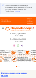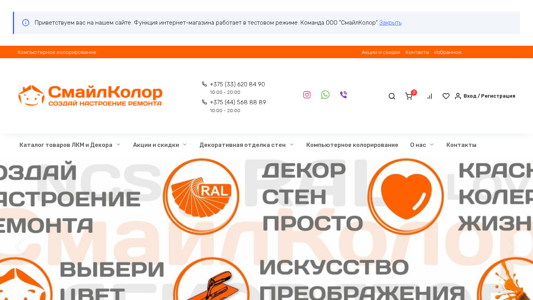 Портал "СмайлКолор" является электронным магазином, предлагающим различные декоративные и отделочные материалы для ремонта в Беларуси. В ассортименте представлены краски, покрытия, декоративные штукатурки, эпоксидные смолы и инструменты для покраски. Покупка товаров возможна по рассрочке. Сайт управляется ООО "СмайлКолор", на нем предоставляются контакты службы поддержки. Каталог разделен на категории: компьютерное окрашивание, акции и контактная информация. Продукция классифицируется под рубриками LKM и Декор, включая тонированные и текстурированные декоративные штукатурки, декоративные краски и добавки, акриловые краски и эмульсии, а также защитные и декоративные материалы для дерева. На момент последнего обновления сайт находится в тестовом режиме.