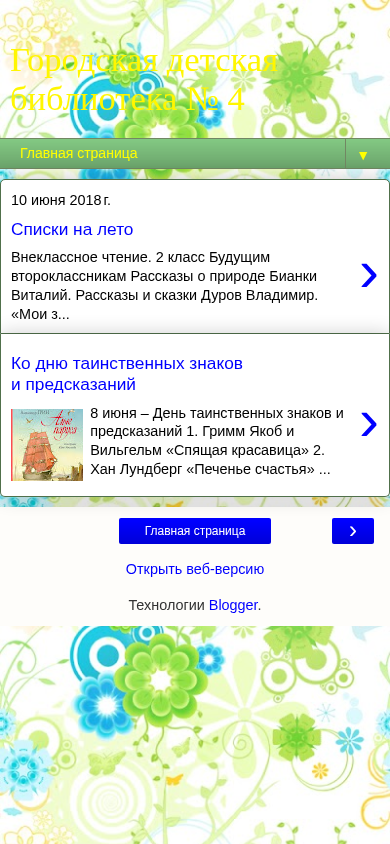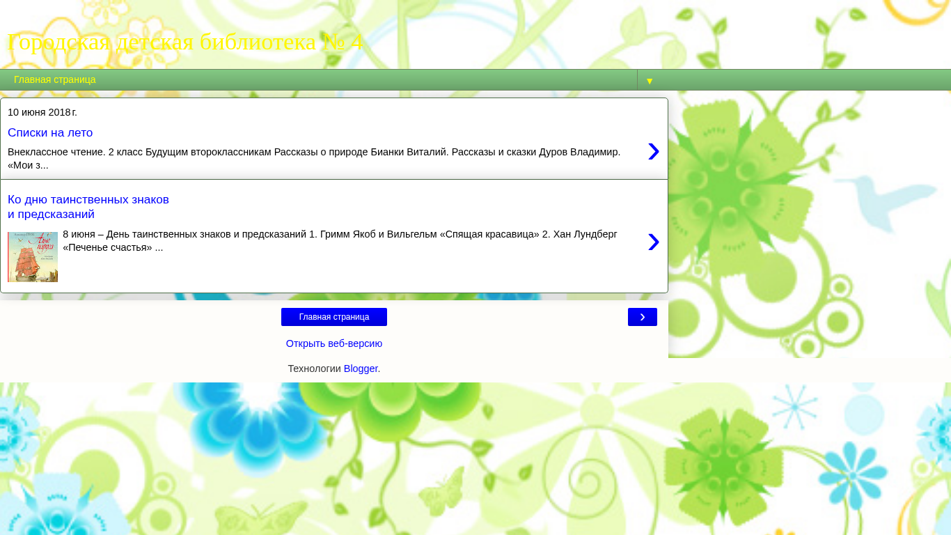 Этот сайт — блог для Детской библиотеки №4 города. Главная страница включает в себя информацию о различных мероприятиях, таких как выставки и мероприятия для детей, включая летний список чтения и приглашение на день, посвященный загадочным знакам и предсказаниям. Блог содержит рассказы, включая те, что касаются природы и сказок, от авторов, таких как Виталий Бианки и Владимир Дуров. Библиотека также связана с Школой православной культуры "Благовест". Блог работает на технологии Blogger и доступен через его веб-версию.