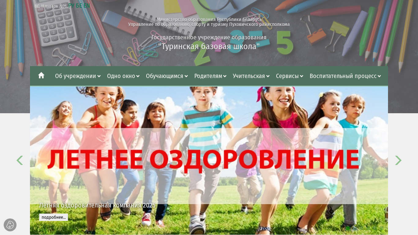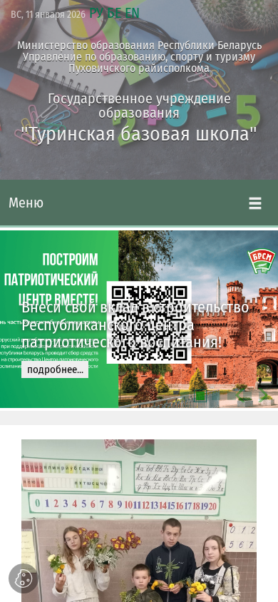 | AI-анализ | The portal Turin.pukhovichi-asveta.gov.by is a Belarusian educational institution website. The title is 'Туринская базовая школа' (Turynskaya bazovaya shkola, Turin Basic School). The description contains words such as 'podrobnee' (detailed), '2025', '2026', 'беларусь' (Belarus), 'образования' (education), 'учреждения' (institutions), 'йская' (Turin), 'педагогический' (pedagogical), 'школа' (school), 'карта' (map), and 'приема' (admission). Keywords include 'contacts', 'режим' (regime), 'год' (year), 'советы' ( |