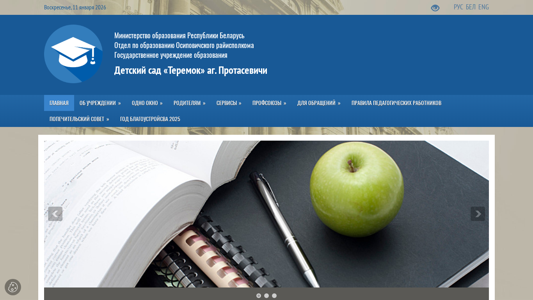 | AI-анализ | This online resource is a website for the Kindergarten "Terebek" in the village of Protasevichi, managed by the Osiipovich Regional Executive Committee of the Ministry of Education in the Republic of Belarus. The site includes information about the kindergarten's structure, news, work schedule, photo gallery, and contact details. Visitors can find details about the kindergarten's administration, pedagogical staff, and services such as "one window" for administrative procedures, as well as normative legal acts and procedures for parents. The site also provides information about the kindergarten's organization, menu, and transportation schedule. There are also sections for electronic applications, answers to frequently asked questions, and a popechiтельский soviet (parent-teacher association) plan of work for 2025-2026. Additionally, there is a page for a |