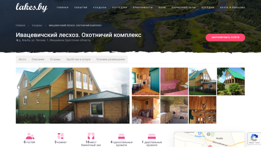 | AI-анализ | The website ivacescles.lakes.by is dedicated to Ivacevich Forestry Complex, an hunting lodge located 24 km from Ivacevichi city in the village of Alba. The complex includes a comfortable 6-person house with a living room by the fireplace, a sauna, a parking lot, and a dog pen. There is also a dining room with a capacity of 16 people. The forestry complex offers various services including hunting and fishing. The house features 3 bedrooms, a kitchen, a bathroom, and a toilet. The kitchen is equipped with a refrigerator, a television, and a microwave oven. Communication facilities include a phone. The complex also offers picnic areas with seating and a fireplace, a sauna for 6-8 people, a billiard table, and a pavilion for larger gatherings. A pond |