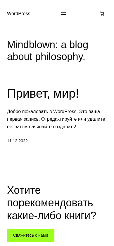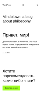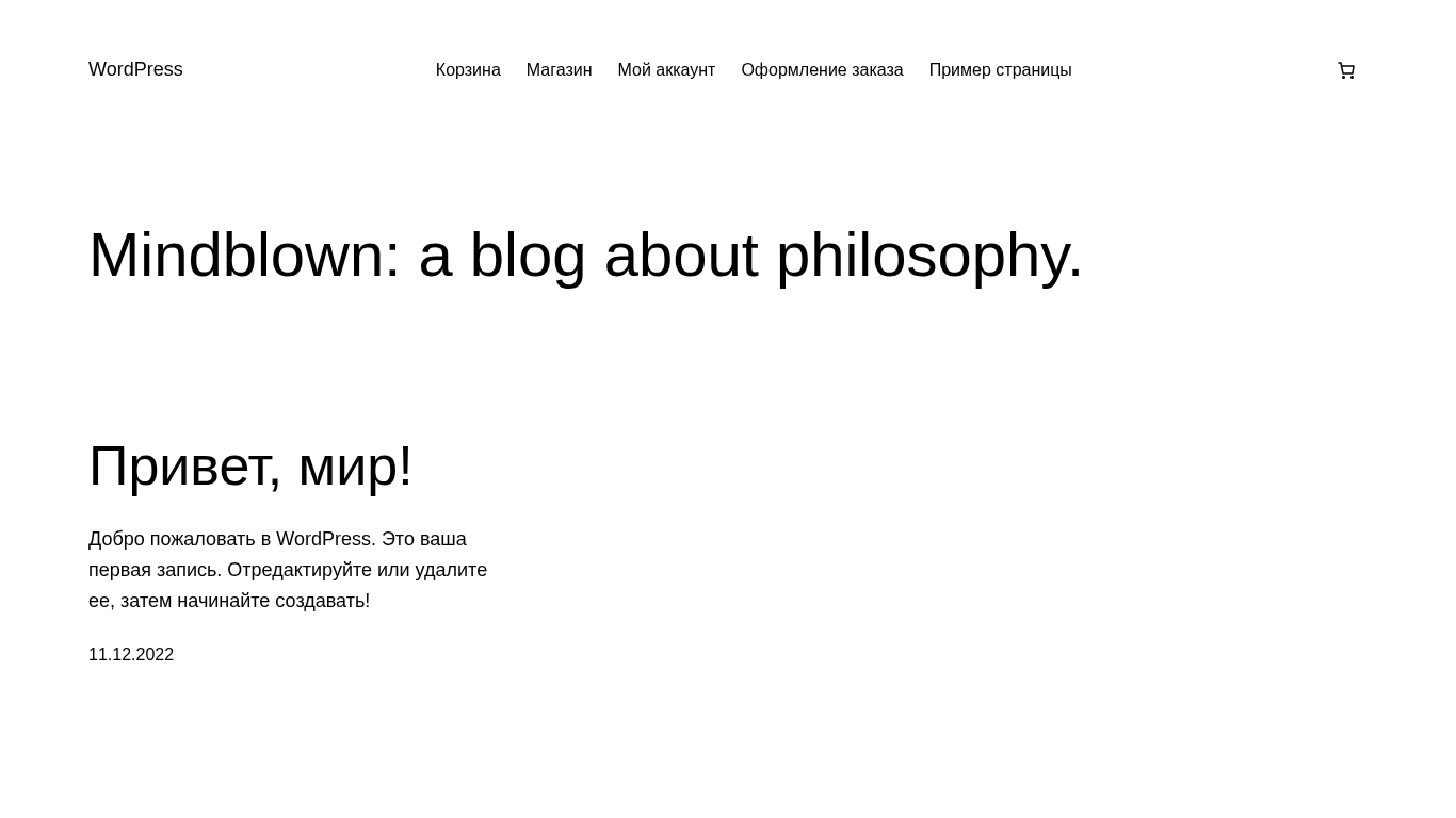 | AI-анализ | The website is a WordPress blog about philosophy, titled "Mindblown," with a description inviting readers to explore the first post and create new ones. Keywords associated with the site include "WordPress," "корзина" (cart), "ваша" (your), "перейти" (go), "содержимому" (content), "магазин" (shop), "мой" (my), "аккаунт" (account), "оформление" (order), "заказа" (order), "пример" (example), "страницы" (pages), "сейчас" (now), "пуста" (empty), and "blog." The site is built using the WordPress platform and has a link to contact WordPress for recommendations. The first post, dated 11.12.2022, invites readers to |