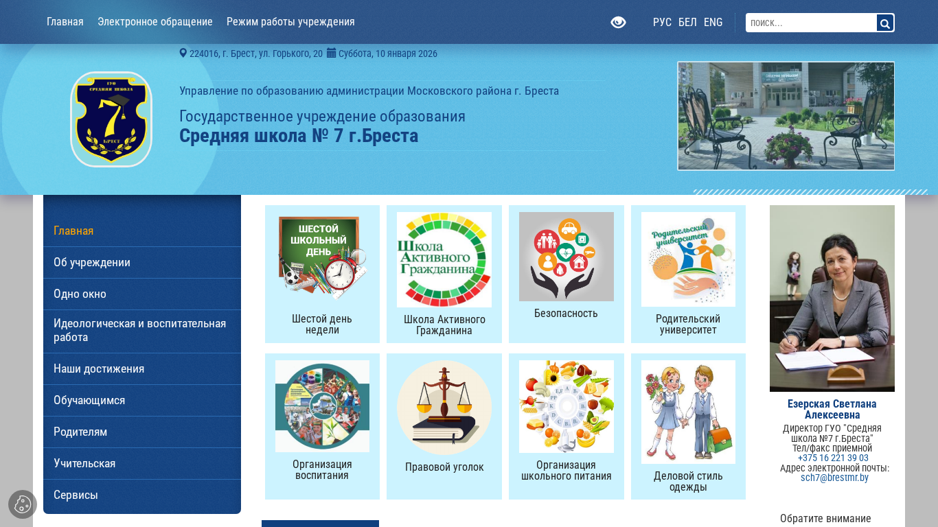 | Адрес | Государственное учреждение образования "Средняя школа №7 г. Бреста", Почтовый адрес:, 224016, г. Брест, ул. Горького, 20 |