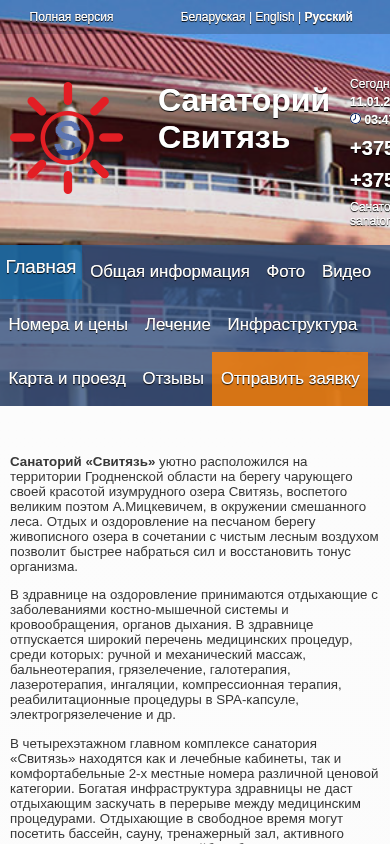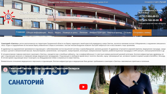 | AI-анализ | The portal Svitiaz Sanatorium provides information on Belarusian sanatoriums and prices for 2026. It is operated by the Belarusian tour operator ChNPUP Automated Tourism Technologies, which is 18 years old. The sanatorium Svitiaz is located in Grodnenksaya oblast', Novogrudsky district, PO Valevka. The GPS coordinates for navigation are 53°26.455' N, 25°54.951' E. The current date is Sunday, 11.01.2026, 03:46. The phone numbers for the sanatorium-resort department are +37517-394-49-11 and +37529-768-30-00. |