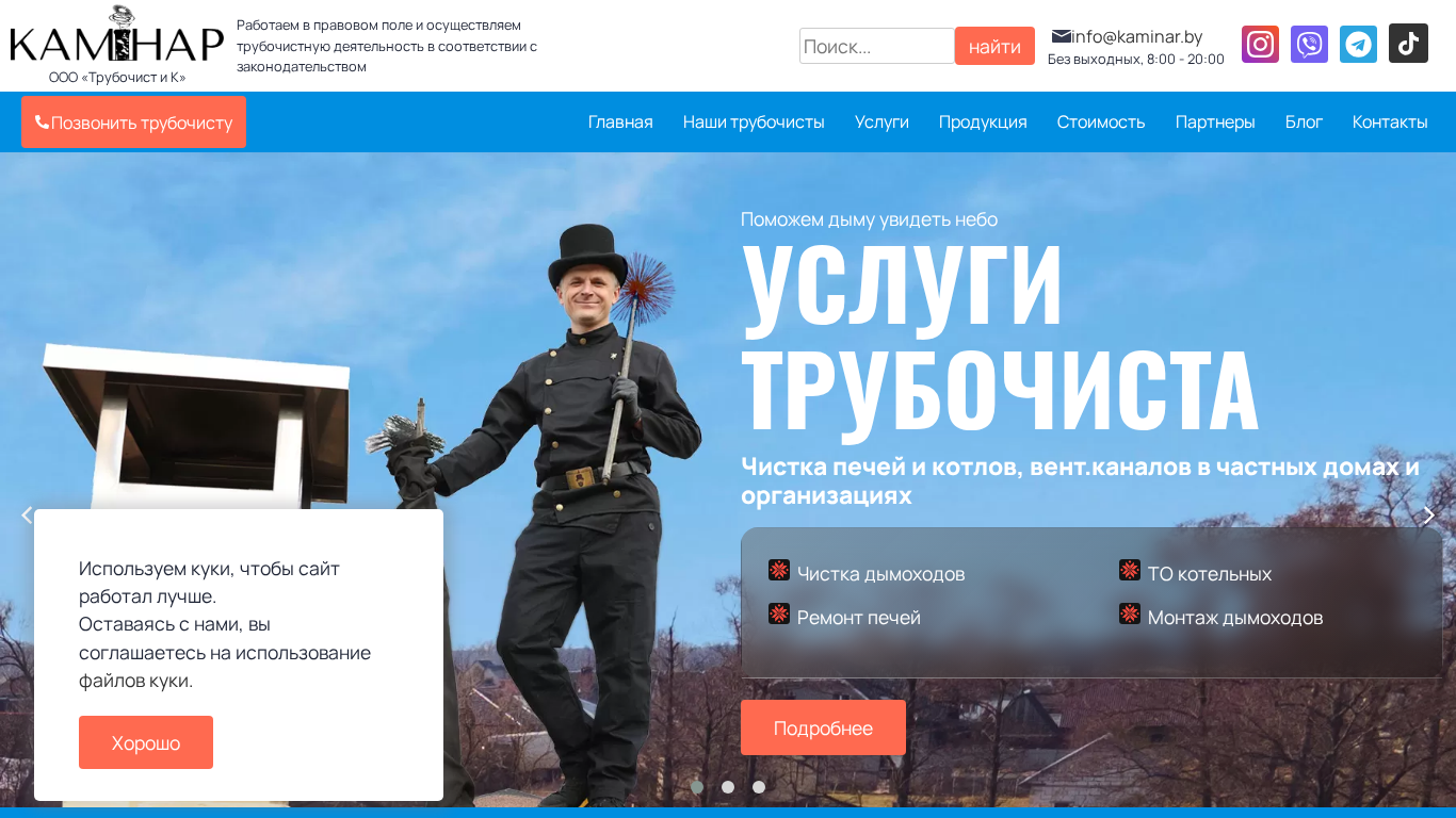 | SEO-описание | Камiнар – трубочисты ООО «Трубочист и К». Осуществляем трубочистную деятельность в соответствии с законодательством. Производим оборудование для трубочистов |