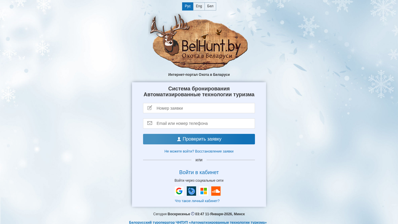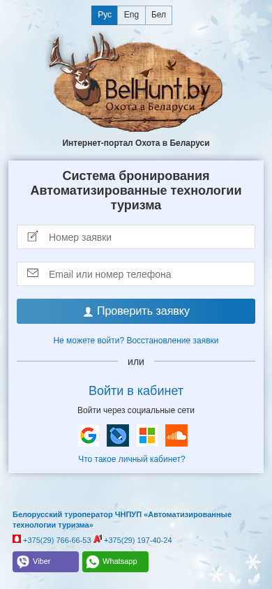 | AI-анализ | This website is an online reservation system for hunting tours in Belarus, operated by the Belarusian state-owned tour operator "Автоматизированные технологии туризма" (ATTT). The system offers automated technologies for booking hunting tours through a personal cabinet, which requires users to enter their email and password to log in, remember me function included. The portal also provides options to check reservations, recover lost applications, or log in through social media networks. Users can contact the company via phone or messaging apps. The website includes information about the company's registration and business hours. The reservation system is not considered a public offer. Users can manage their applications through the personal cabinet. |