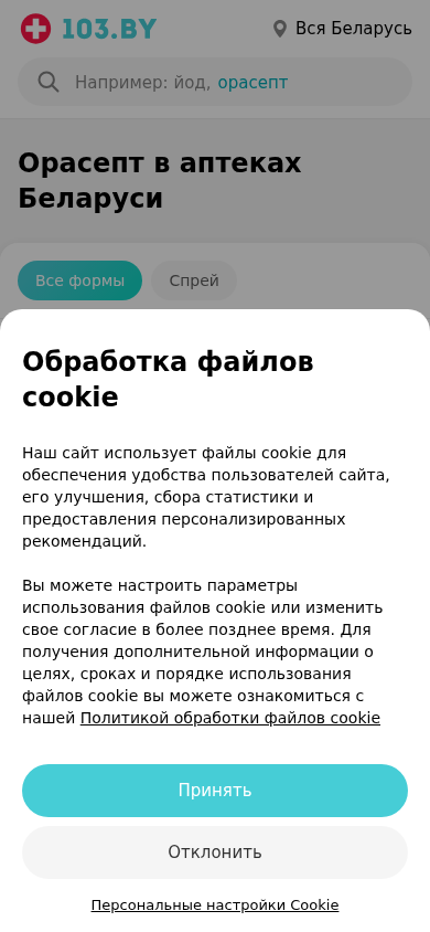 Проект веб-сайта "Orasept.103.by" представляет собой белорусский сайт аптеки, сосредоточенный на обеспечении доступности и стоимости Orasept – конкретного препарата – в различных аптеках по всей Беларуси. Пользователи могут искать Orasept и находить его цену и наличие в разных аптеках через каталог сайта. Платформа 103.by предлагает удобный способ поиска лекарств в Беларуси. Сайт предоставляет информацию о форме, диапазоне цен и наличии спрея Orasep, который является потребительским продуктом от Bayer Consumer Care из Швейцарии, доступным без рецепта. На сайте также представлены инструкции по применению, корзина покупок, список избранного, раздел профиля пользователя и возможность добавить аптеку на платформу бесплатно. Сайт использует куки для улучшения пользовательского опыта, сбора статистики и предоставления персонализированных рекомендаций. Пользователи могут управлять настройками куки или изменять их.