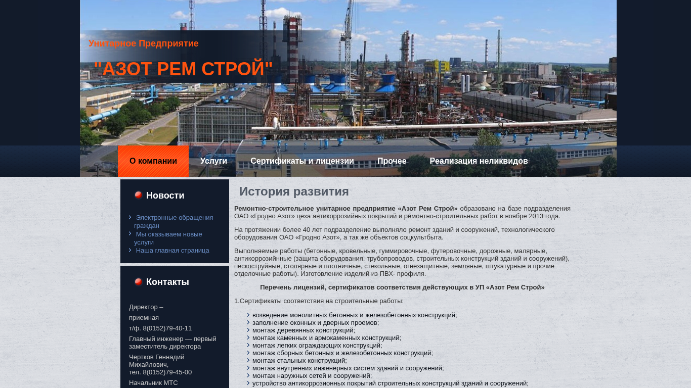 Сайт "Азот Рем Строй" (Azot Rem Stroy) представляет собой онлайн-присутствие единого предприятия Беларуси, специализирующегося на услугах ремонта и строительства. Основанный в 2013 году, он возник из подразделения "Гродно Азот", приняв под свой контроль антикоррозийные покрытия и деятельность по ремонту-строительству. Компания предлагает широкий спектр услуг, включая, но не ограничиваясь, восстановление зданий и сооружений, техническое обслуживание, проверку пожарных лестниц, производство и установку окон, а также различные сертификаты и лицензии. Сайт содержит информацию о истории компании, контактах и широком спектре административных процедур и услуг. Также на сайте представлены разделы для вакансий, закупок, продажи и реализации неликвидных активов. Сайт предлагает множество интеграций с картами и имеет.