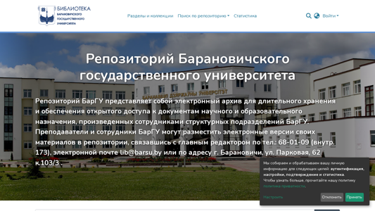 | AI-анализ | Этот сайт является электронным хранилищем Барановичского государственного университета (БГУ), которое обеспечивает долгосрочное хранение и открытый доступ к научно-образовательным документам, созданным его сотрудниками. Сотрудники и преподаватели БГУ могут загружать электронные версии своих материалов в репозиторий, обращаясь к главному редактору по телефону 68-01-09 (внутр. 173), электронной почте lib@barsu.by или по адресу: г. Барановичи, ул. Парковая, 62 к.103/3. Репозиторий включает разделы для аннотаций диссертаций, материалов конференций, монографий, научных результатов, научных публикаций и периодических изданий БГУ. Пользователи могут искать и выбирать раздел для просмотра его коллекций. На данный момент показано восемь коллекций, включая аннотации диссертаций, материалы конференций, монографии, научные результаты, научные публикации, и т.д. |