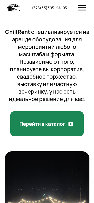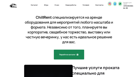 Портал ChillRent — это сервис по аренде оборудования и мебели для мероприятий в Беларуси. Он предлагает широкий ассортимент товаров, включая палатки, световую декорацию, стулья и многое другое, чтобы обеспечить комфорт и стильное проведение мероприятия. ChillRent работает с 2019 года и стремится сделать каждое мероприятие незабываемым благодаря вниманию к деталям и профессиональной поддержке. Компания предлагает разнообразный выбор оборудования, от светотехники до мебели и игр, обеспечивая тем самым полное использование потенциала каждого события. Все товары проходят строгий контроль качества на предмет безопасности и долговечности, а команда экспертов готова помочь в выборе оборудования, доставке и установке. ChillRent обслуживает различные виды мероприятий, включая корпоративные мероприятия, свадьбы, выставки и частные вечеринки, стремясь обеспечить полное удовлетворение клиента с индивидуальными решениями, адаптированными под конкретные требования и бюджеты.