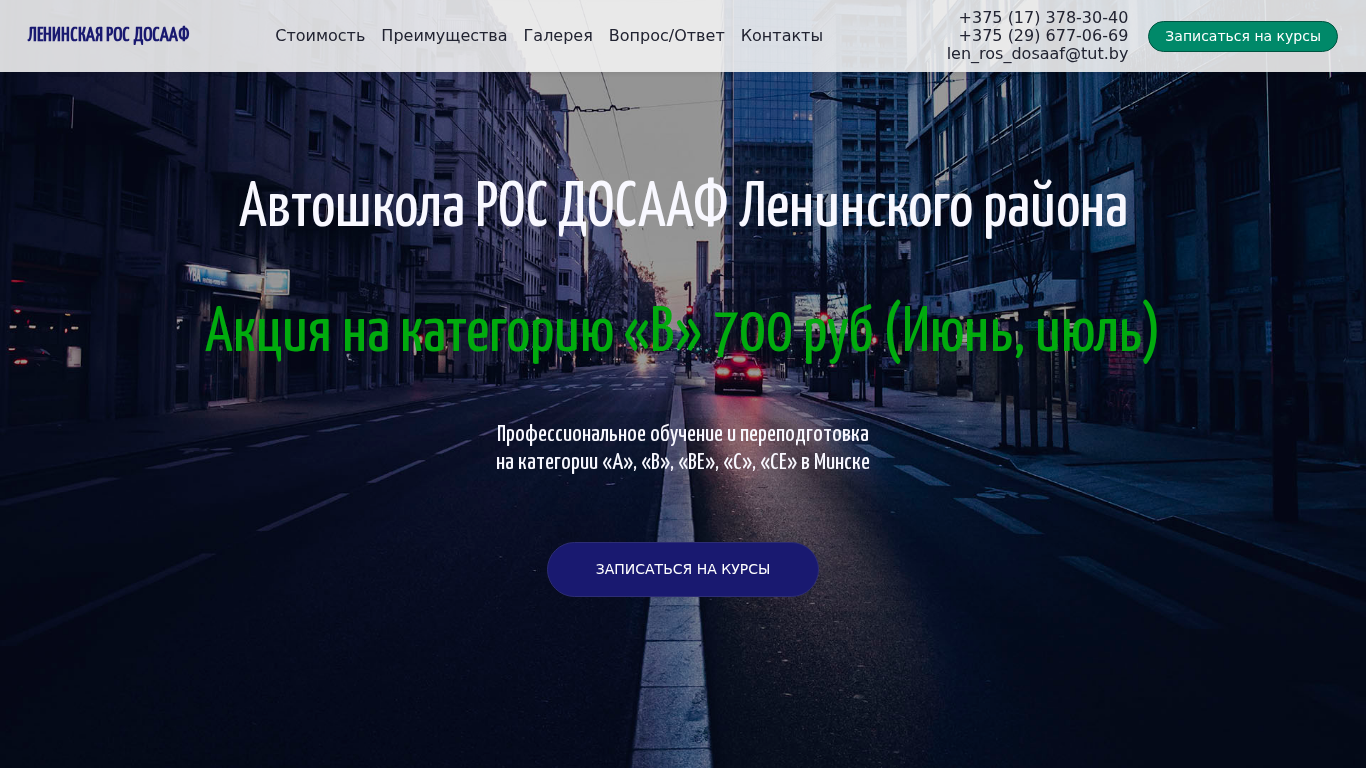 Сайт <lenrosdosaaf.by> представляет собой платформу для профессионального обучения и переподготовки в различных категориях управления транспортными средствами в Минске, Беларусь. Он предлагает курсы и тренинги по категориям 'A', 'B', 'VE', 'C' и 'CE'. Сайт содержит раздел для автошколы, где пользователи могут подписаться на курсы категории 'B' с скидками в июле. Цена за курс категории 'B' составляет 700 рублей, а продолжительность — три и полтора месяца. Пользователи также могут переобучиться из категории 'B' в 'BE' и из 'B' в 'C' за 550 рублей каждая, а из 'B' или 'C' в 'A' за 250 рублей. Автошкола предлагает также курс по международному транспорту, с пятью днями в неделю на протяжении пяти месяцев, и дополнительные практические занятия.