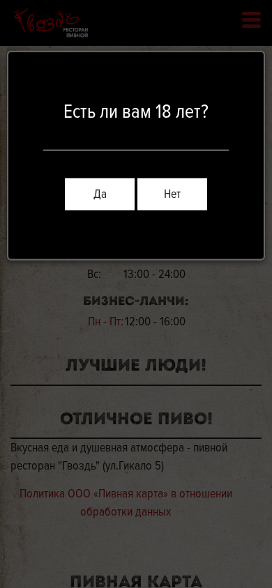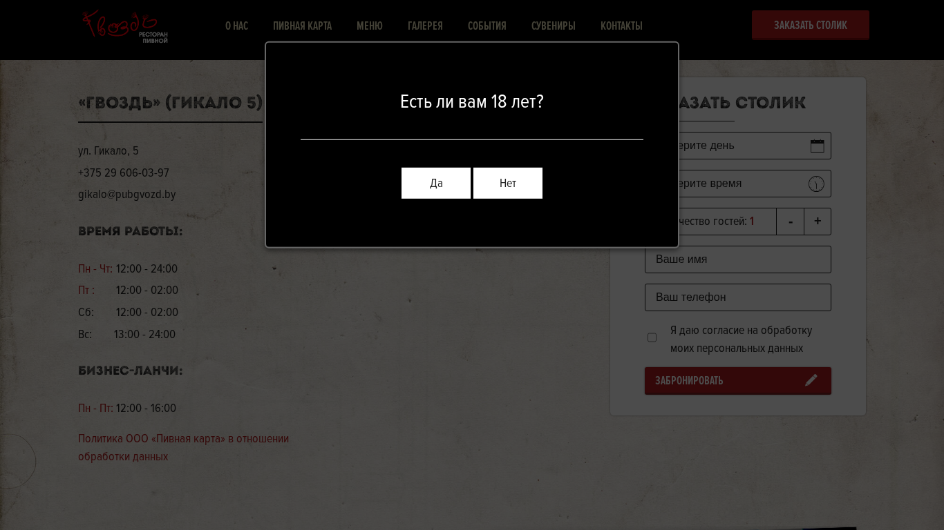 АдресПолитика ООО «Пивная карта» в отношении обработки данных, Забронировать, Контакты, «Гвоздь», Гикало, ул. Гикало, 5