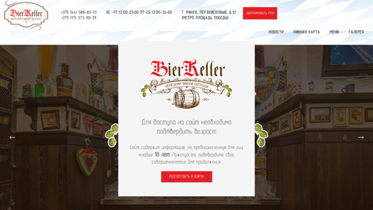 | AI-анализ | Проект "Бир Келлер" представляет собой немецкую пивную подвал в Минске, Беларусь. В учреждение можно сделать онлайн-заказ на столик по номерам +375 (44) 588-83-33 и +375 (17) 373-90-39. Часы работы: с понедельника по четверг - с 12:00 до 23:00, а с пятницы по воскресенье - с 12:00 до 24:00. Адрес указан как г. Минск, пер. Войковский, д. 12 (метро Площадь Победы). На сайте представлен меню с восемью видами кеглинга, а также послеобеденное меню от 12:00 до 16:00, два бездымных зала и возможность для размещения 68 мест. |