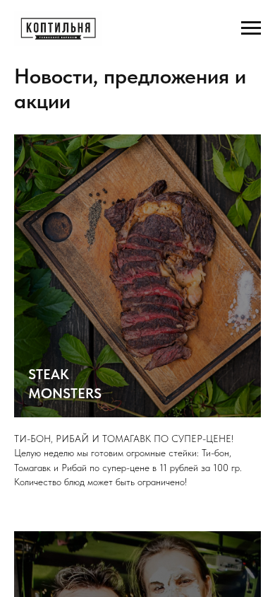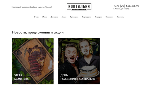 Сайт SmokeBBQ.by представляет собой ресторан под названием "Коптильня" в Минске, Беларусь, предлагающий концепцию полного барбекю с собственным камином. Сайт предоставляет информацию о меню, доставке, акциях, корпоративных мероприятиях, подарках, вакансиях и контактах. Ресторан специализируется на тексасском стиле барбекю и предлагает стейки, ребра и курицу, с различными методами приготовления, включая копчение, гриль и запекание. Сайт также предлагает дневные и выходные акции, включая скидки на большие стейки. Акция по случаю дня рождения также доступна, при которой предоставляется 15% скидка на меню для человека, отмечаемого днем рождения, а также за неделю до и после этого дня. Ресторан расположен по адресу улица Гикало, 7 в Минске, с указанием телефонного номера для бронирования. Сайт включает информацию о новостях и предложениях.