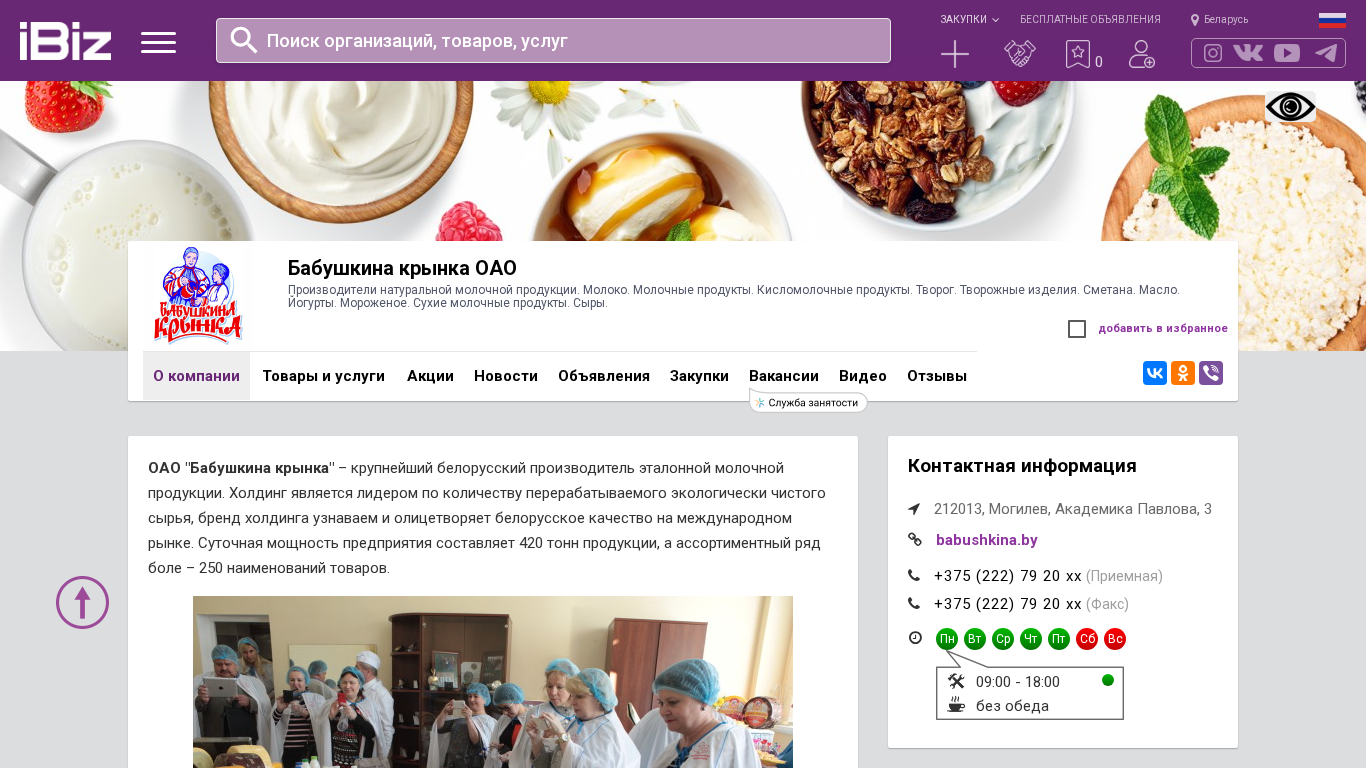 | Название / Заголовок | Бабушкина крынка ОАО - Производители натуральной молочной продукции. Молоко. Молочные продукты. Кисломолочные продукты. Творог. Творожные изделия. Сметана. Масло. Йогурты. Мороженое. Сухие молочные продукты. Сыры.. 212013, Могилев, , Академика Павлова, 3 |