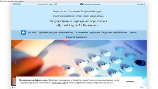 | AI-анализ | Сайт предназначен для детского сада в городе Бельничи, Беларусь. Заголовок сайта — "Детский сад №3 г. Бельничи", что переводится как "Дошкольное учреждение №3 в Бельничи". Описание не заполнено. Основные слова на сайте связаны с образованием, включая "образования" (образование), "учреждения" (учреждения), "график" (график), "режим" (режим), и "педагогический" (педагогический). Сайт также использует куки и содержит ссылку на политику конфиденциальности. Меню включает разделы, такие как "Административные процедуры", "Контакты", и "График работы администрации". |