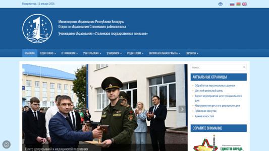Проект веб-сайта "Столинская государственная гимназия" (Stolin State Gymnasium) представляет собой белорусское образовательное учреждение, основанное в январе 2026 года под юрисдикцией Министерства образования Республики Беларусь. Гимназия расположена в Столине и управляется Столинским районным исполнительным комитетом. Сайт предоставляет информацию о расписании, процессе приема, административных процедурах, контактных данных, истории, а также о различных инициативах, таких как инновации, школьной библиотеке и родительском университете. Гимназия предлагает персонализированные услуги по обработке данных, новости и безопасную среду для обучения с сертификатом. Сайт включает информацию о структуре организации, школьной столовой, консультациях родителей, а также дополнительных платных образовательных услугах. Гимназия также сосредоточена на профессиональном обучении, здравоохранении и гражданском воспитании. На сайте представлен архив новостей, гостевая книга и функция поиска.