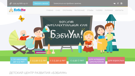| SEO-описание | Детский центр развития «БэбиУм» приглашает детей от 4 месяцев до 10 лет и их родителей расти, играть и развиваться вместе с детским центром раннего развития! |