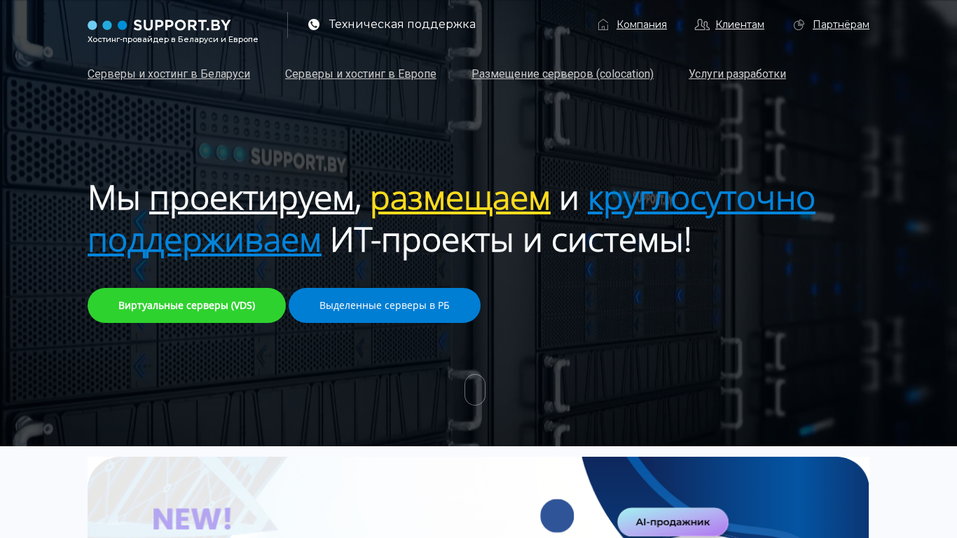 Портал Support.by — это белорусский провайдер хостинга, предлагающий услуги хостинга в Беларуси и Европе, включая виртуальные серверы, выделенные серверы, хостинг для CMS Bitrix и регистрацию доменов. Он обеспечивает техническую поддержку 24/7 и SLA для оплачиваемых услуг. Сайт предлагает решения по хостингу для различных потребностей, включая Bitrix, 1C-Bitrix и платформы для стриминга, а также услуги телефонии и подключения к искусственному интеллекту. Кроме того, он предоставляет услуги разработки и решения для школ. Компания имеет публичный контракт и сертификаты. Сайт включает в себя блог, вакансии, отзывы клиентов и контакты на техническую поддержку.