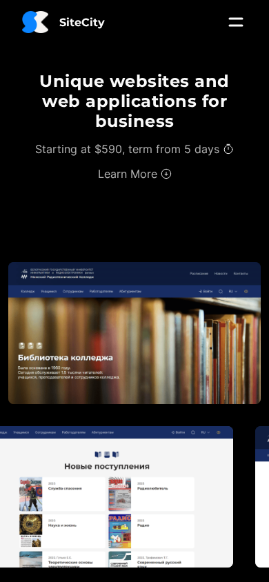 | AI-анализ | Портал SiteCity предлагает разработку веб-сайтов и веб-приложений на полный цикл работ, обеспечивая современный дизайн, удобство навигации и функциональный код. Разработка осуществляется с использованием актуальных фреймворков и библиотек, что позволяет создавать уникальные продукты с профессиональной технической поддержкой по цене от $590, при этом в стоимость включено один месяц бесплатной поддержки после завершения проекта. Веб-сайт оптимизирован под поиск в поисковых системах, обладает стильным и адаптивным дизайном, обеспечивает устойчивость и безопасность. Примеры предыдущих проектов включают каталог медицинских товаров на React (Next.js), который предоставляет быстрый поиск продуктов, удобное фильтрацию и продвинутую систему публикаций, а также корпоративный сайт Минского радиотехнического колледжа, построенный на Django, обеспечивающий надежность и современные функции управления. |