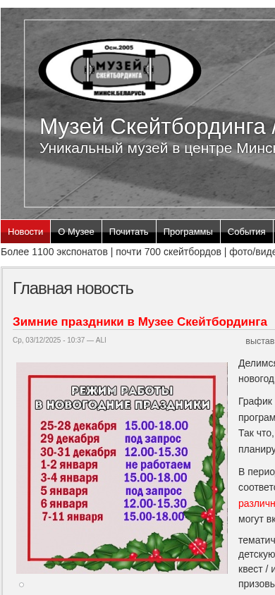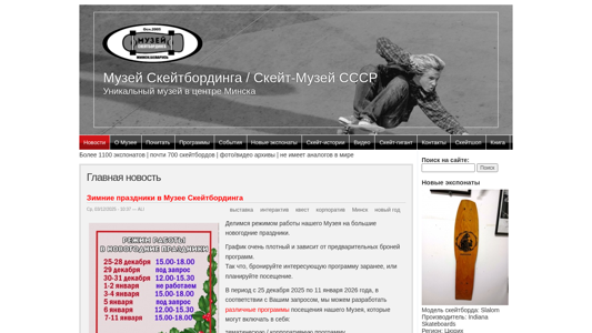 | AI-анализ | The website, Minsk8Museum.by, is a unique museum located in the center of Minsk, Belarus, dedicated to the history of skateboarding. With a permanent exhibition, the museum showcases over 1100 items, including nearly 700 skateboards and extensive photo/video archives. It is the only museum of its kind in the world. During the winter holidays, visitors can enjoy various programs and activities, such as thematic or corporate events, children's programs, quizzes and interactive prizes, master classes, film showings, photo sessions, and special programs. The museum also supports local events like the "Kaladnaya Barakhola," a vintage market, and hosts RE-SK8, a workshop that creates unique souvenirs from old skateboards. |