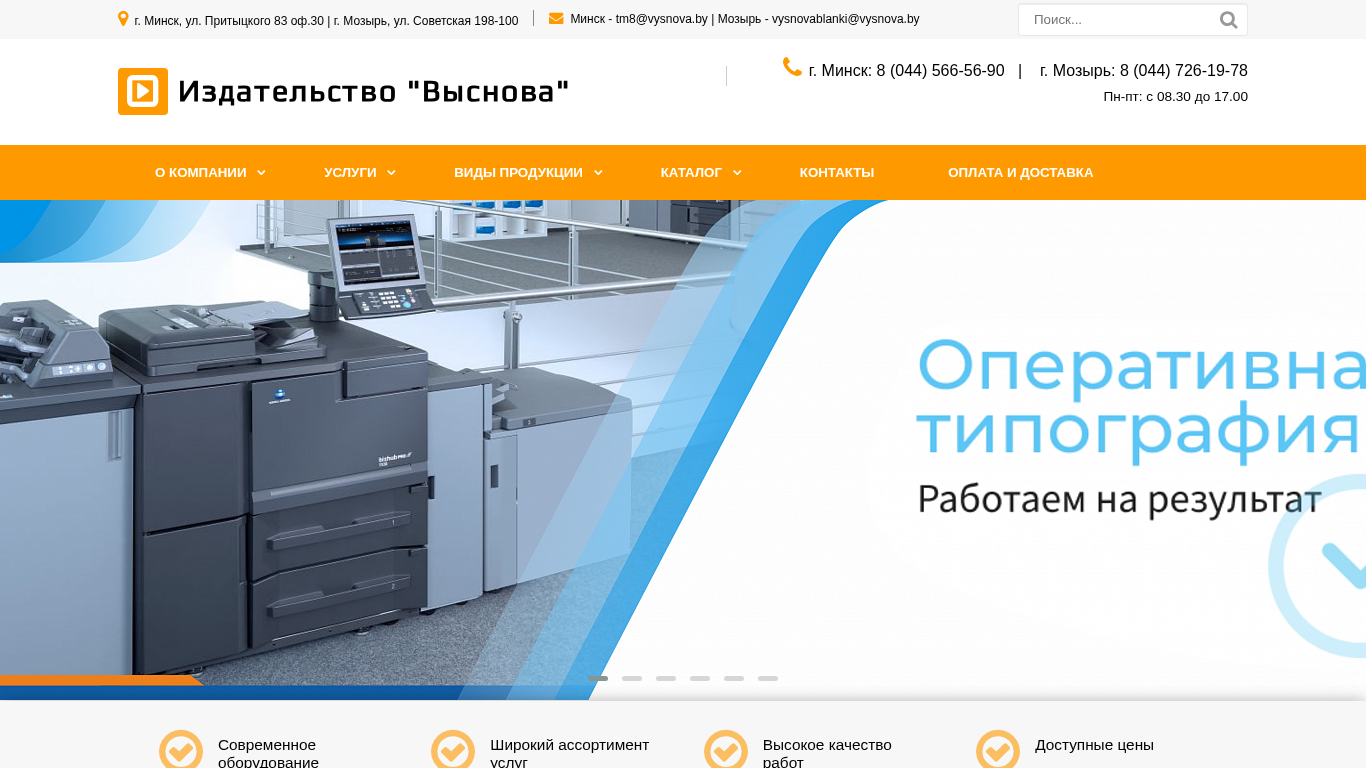 | AI-анализ | The website Vysnova.by, published by the Vysnova Publishing, is based in Minsk, Belarus, with additional office in Mozyr. The company offers various services including the production of journals and books, printing of firm logos and names, and the creation of forms for different industries. They also provide safety and certification services, including industrial safety, electrical safety, and work safety. The website offers a catalog of their products and services, as well as contact information for both Minsk and Mozyr offices. The company's menu includes sections on their company, services, types of products, and contacts for payment and delivery. The product categories include journals and books, folders, certificates, signs and labels, and safety posters. The website also provides information on their safety services, such as industrial safety, electrical safety, and work safety, as well as personnel services including accounting |