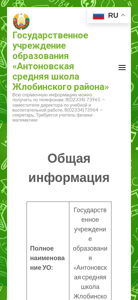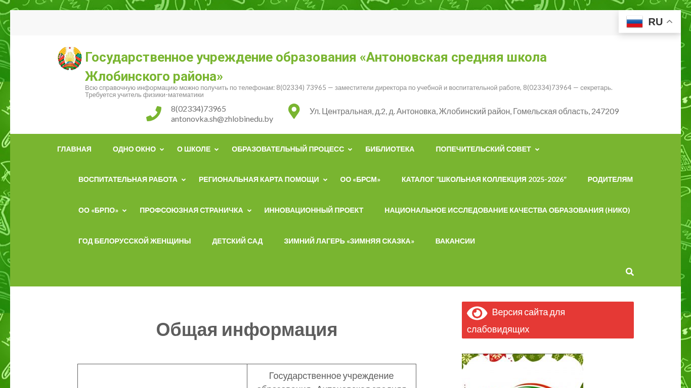 | Название / Заголовок | Государственное учреждение образования «Антоновская средняя школа Жлобинского района» — Всю справочную информацию можно получить по телефонам: 8(02334) 73965 — заместители директора по учебной и воспитательной работе, 8(02334)73964 — секретарь. Требуется учитель физики-математики |