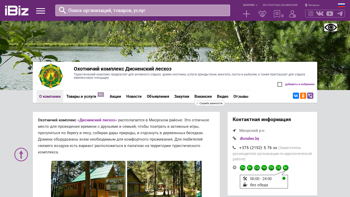 | Название / Заголовок | Охотничий комплекс Дисненский лесхоз - Туристический комплекс предлагает для активного отдыха: домик охотника, услуги аренды бани, мангала, охоты и рыбалки, а также приглашает для отдыха кемпинговую площадку . 0, |