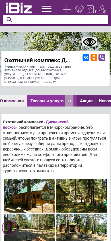 | AI-анализ | <-- The web project "Охотничий комплекс Дисненский лесхоз" is a tourist complex offering active recreation: a hunter's cabin, rental services for a sauna, barbecue, hunting and fishing, and also invites campers to a campsite. The complex is located in the Miorsky district and provides opportunities for friends and family to engage in active games, take leisurely walks by the lake and in the forest, and relax in wooden gazebos. The cabins are fully equipped for comfortable living. For nature lovers, there is an option to camp on the complex's territory. Services offered by the hunting complex include accommodation in hunter's cabin #1, accommodation in hunter's cabin #2, accommodation for commanders, accommodation for foreign citizens, sauna rental, barbecue grill rental, mangal rental with shamp |