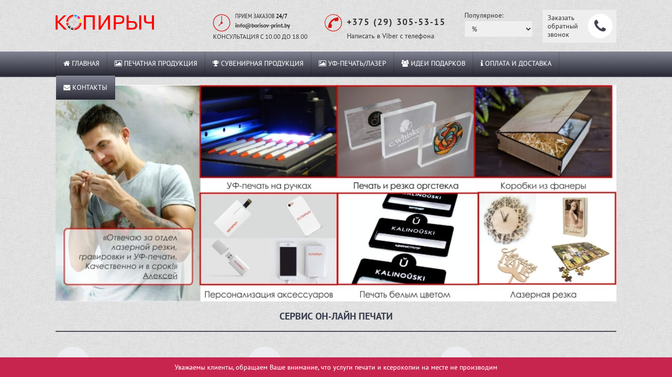 | SEO-описание | Печатный центр «КОПИРЫЧ» в Борисове. ☎ +375293055315 ✔️ Печать визиток, листовок, баннеров, печать на майках, кружках, полиграфическая продукция, ✔️ УФ-печать, лазерная резка и гравировка, брендирование, дизайн, ✔️ наградная атрибутика, сувенирная продукция. |