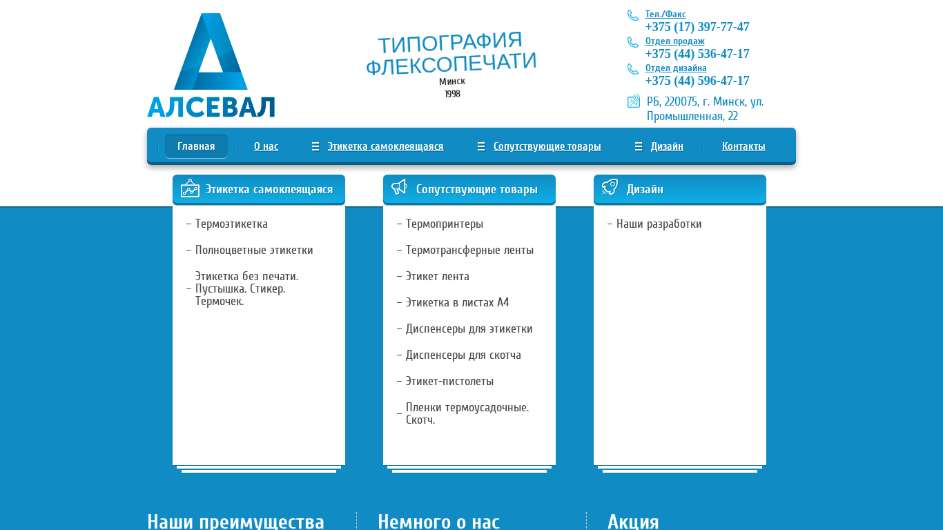 | SEO-описание | Общество с ограниченной ответственностью «АЛСЕВАЛ» обеспечение торгово-логистических предприятий этикеточной продукцией, гибкой упаковкой различных типов и размеров |