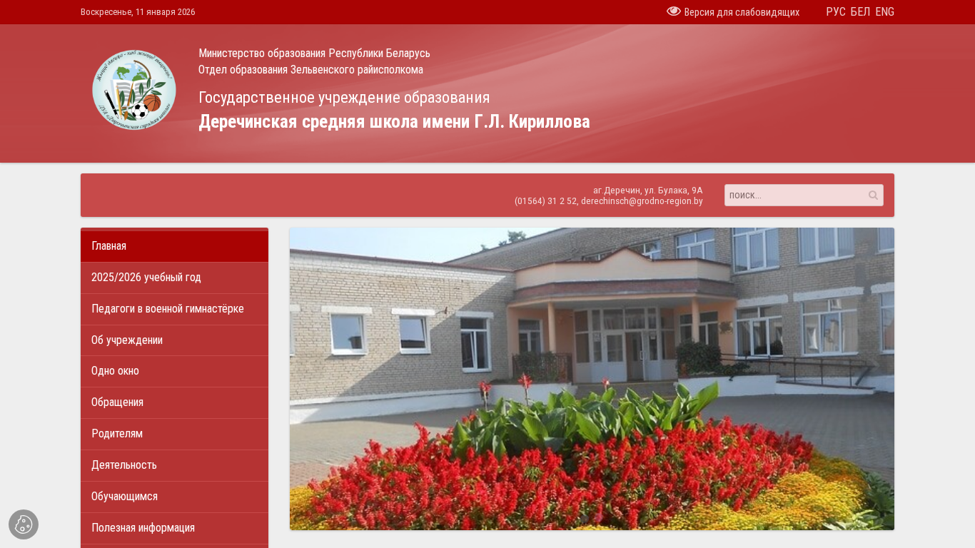 | Адрес | соцсетях:, © 2026, Деречинская средняя школа им. Г.Л. Кириллова, ВЕБ-МАСТЕРСКАЯ.БЕЛ, Адрес: аг.Деречин, ул. Булака, 9А |