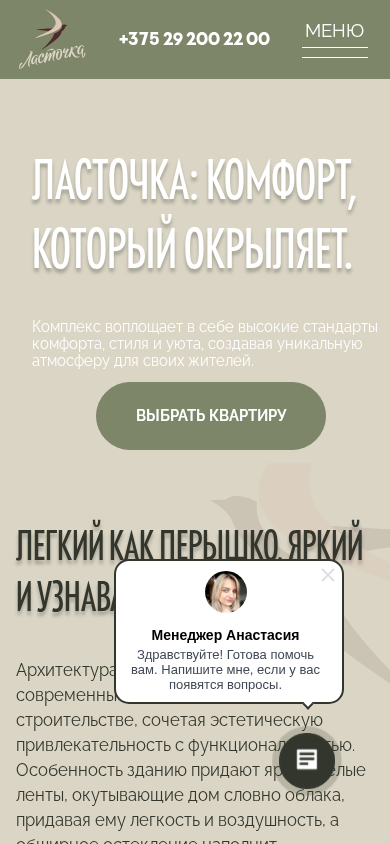 | SEO-описание | Жилой комплекс Ласточка - купить квартиры в Бресте от застройщика. Продажа квартир в новостройках: ✔️ цены, ✔️ ход строительства, ✔️ планировка, ✔️ фото ☎ +375 29 200 22 00 |