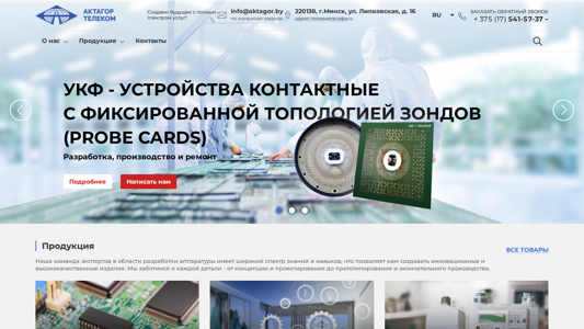 | AI-анализ | The website "ЗАО "Актагор-Телеком" - aktagor.by" is a business-to-business platform for the development and production of electronic equipment. Key offerings include high temperature probe cards, contact probes with fixed topology, cantilever probe cards using BLADE probes, and various printed circuit boards and electronic modules. The company specializes in the manufacturing of ultrasonic gas meters, fire alert systems, and contact systems with fixed topology probes. The website provides detailed information about their products, documents, and video demonstrations. Contact information includes a phone number and email address for inquiries and orders. The main office is located in Minsk, Belarus. |