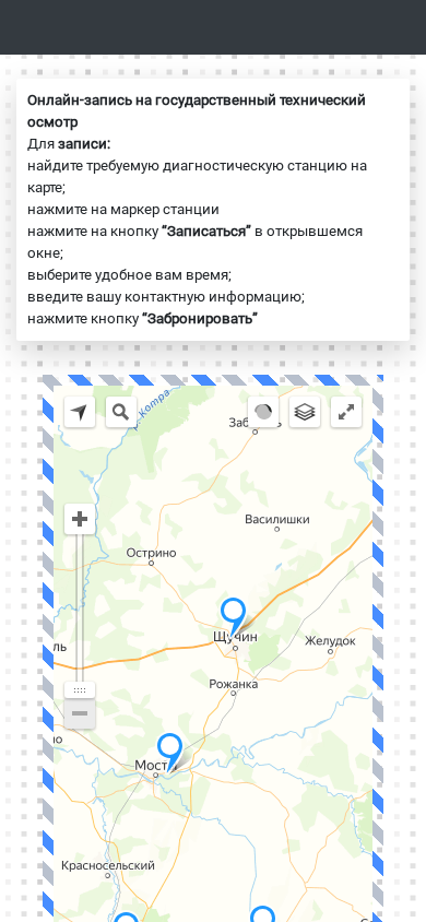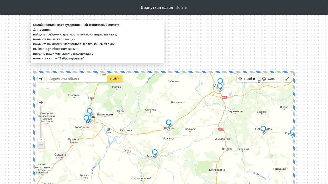 | AI-анализ | The website is an electronic registration platform for scheduling state technical inspections (гостехосмотр) in Belarus. Users can find their desired diagnostic station on a map, click on the marker, and press the "Записаться" button in the pop-up window to register for an appointment. They will then choose a convenient time and enter their contact information before confirming the reservation. The platform is powered by Yandex and is accessible via the provided link. |