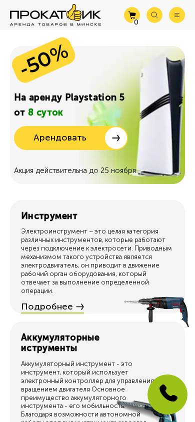 | AI-анализ | Этот сайт под названием "Прокатчик" сосредоточен на продаже и доставке различных инструментов, оборудования и аксессуаров. Сайту присвоены ключевые слова "доставка", "инструмент", и "технология", с словами "доставка" и "инструмент" встречаются наиболее часто. На сайте представлен каталог товаров, включая электроинструменты, садовое оборудование, чистящие средства, медицинское оборудование и многое другое. Предлагается номер контакта "354-00-43", а также информация о самовывозе и доставке, и раздел для новостей и акций. Сайт также включает в себя раздел аренды PlayStation 5. Главная страница украшена баннером с рекламой предложения по аренде PlayStation 5, действующим до ноября 25-го. Сайт расположен на домене .BY. |